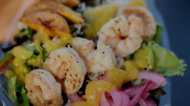 Crisp mixed greens with black beans, colorful bell peppers, basmati rice, pickled onions, and sweet plantains with a spicy mango mango habanero dressing – it’s sweet, spicy, and soul-satisfying.